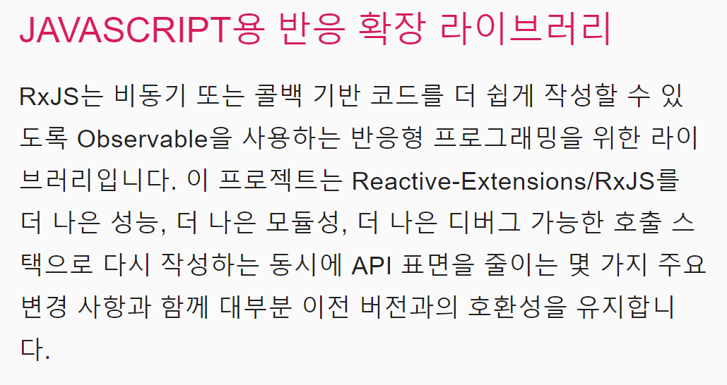 RxJS는 Reactive Extensions for JavaScript의 약자입니다. 처음에 Reactive Extension은 마이크로소프트에서 Rx.NET으로 개발했습니다. 그 이후로 Java, Python, Ruby, JavaScript를 비롯한 여러 다른 언어로 구현되었습니다. RxJS를 이용하는 프레임워크로는 Angular, React, Vue가 있습니다. 물론 JavaScript와 TypeScript와 같은 언어와 함께 RxJS를 쓸 수 있습니다. RxJS의 공식문서에 따르면 RxJS에 대한 정의를 다음과 같이 내리고 있는데요.