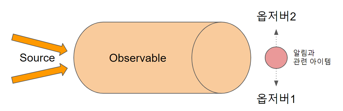 왼쪽에 이벤트 혹은 데이터 값의 소스가 들어옵니다. 이벤트가 발생하거나 값이 수신될 때마다 Observable은 관련 값과 함께 알림을 보냅니다. 옵저버블에 구독한 모든 옵저버는 알림을 받고 그 방출에 반응하게 됩니다. 그리고 만약 여러 개의 구독한 옵저버가 있다면, 각각의 옵저버는 통지를 받고 그 방출에 반응할 수 있습니다.