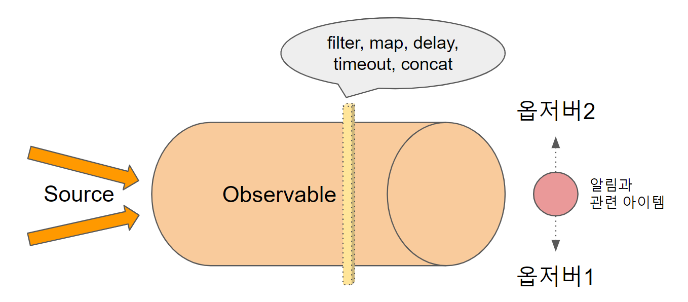 Observable을 옵저버에게 항목을 모으고 방출하는 배관 혹은 컨베이어라고 생각해보세요.