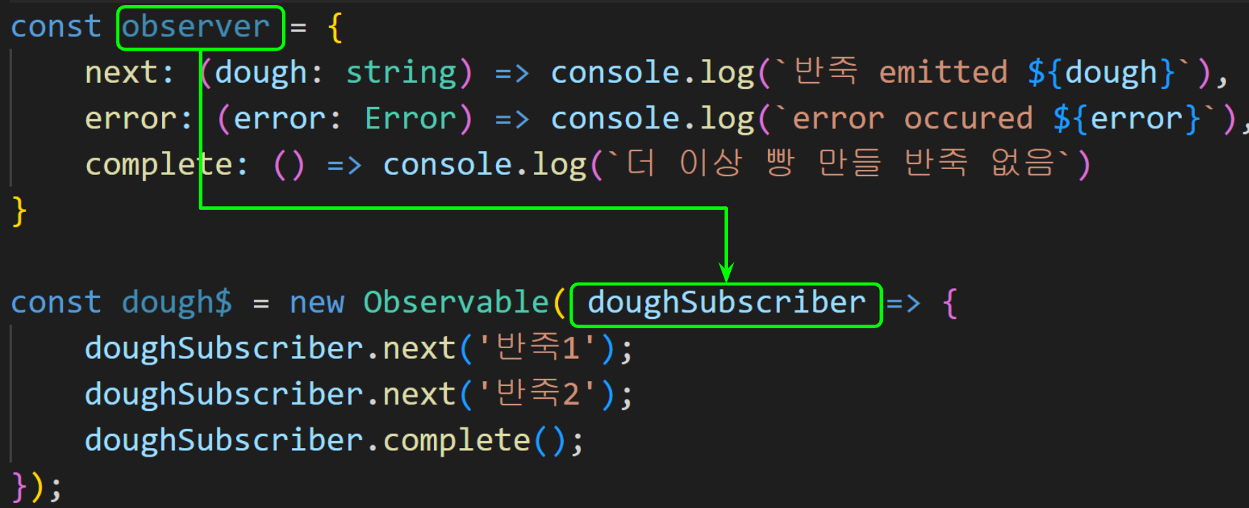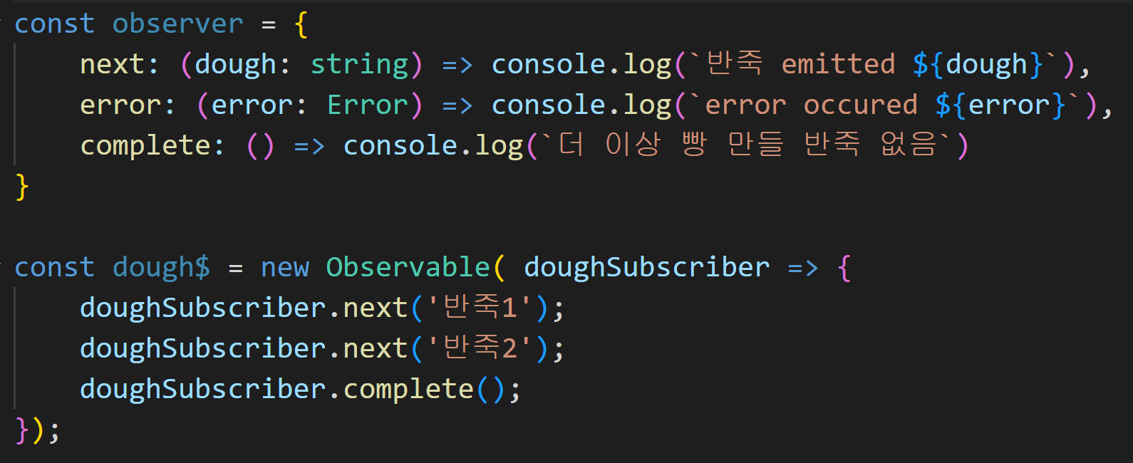 new 키워드를 사용해서 옵저버블을 생성할 수 있습니다. dough$ 변수에 옵저버블을 할당해 주었는데요. $는 데이터가 연속적으로 흐른다 하여 Stream에서 파생된 기호입니다. 달러 기호($)를 사용해줌으로 개발자들에게 이 변수가 Observable임을 시각적으로 알려줄 수 있습니다. 생성자에서 선택적으로 옵저버블이 구독(Subscribe)될 때 호출되는 함수를 제공합니다.