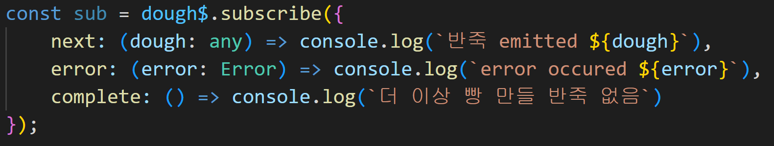 이제 subscribe 메소드를 호출할 때 next, error, complete 메소드가 있는 옵저버 객체를 직접 전달하고 있습니다.