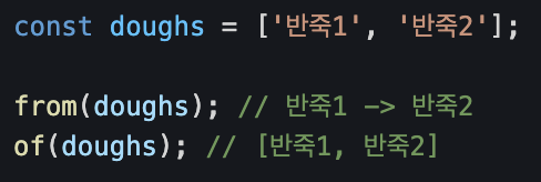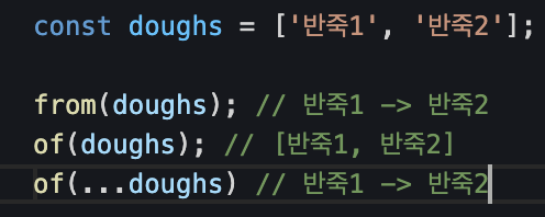 이 배열을 from에 전달하면 from 생성 함수가 데이터 구조의 각 요소(이 경우 배열)를 가져와서 방출을 하고 이 경우는 두 개의 반죽이 방출됩니다. 동일한 배열을 of 함수에 전달하면 개별 반죽이 아닌 반죽 배열 단 하나만의 항목이 방출됩니다. of함수의 경우 각 인수를 내보내는데 첫 번째 인수가 반죽 배열이기 때문에 배열이 통으로 배출되게 됩니다.