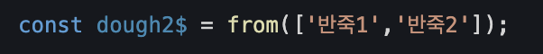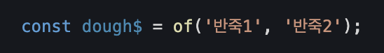 이 배열을 from에 전달하면 from 생성 함수가 데이터 구조의 각 요소(이 경우 배열)를 가져와서 방출을 하고 이 경우는 두 개의 반죽이 방출됩니다. 동일한 배열을 of 함수에 전달하면 개별 반죽이 아닌 반죽 배열 단 하나만의 항목이 방출됩니다. of함수의 경우 각 인수를 내보내는데 첫 번째 인수가 반죽 배열이기 때문에 배열이 통으로 배출되게 됩니다.