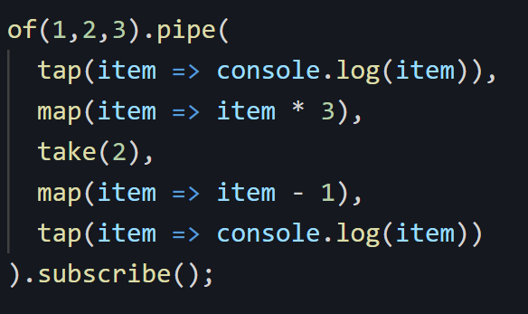 예상한 대로 출력이 되었나요? 처음 소스 옵저버블 of(1,2,3) 에서 1이 방출되고 tap연산자를 통해 콘솔에 1이 출력됩니다. map 연산자를 통해 1이 3으로 매핑됩니다. 이제 take연산자를 통과하게 되고 take에서 지정된 숫자는 2이고 아직 take에서 내부적으로 카운트된 숫자는 1이므로 숫자를 방출시킵니다. 이제 다음 map 연산자에서 item -1 이 되고 숫자 2가 방출됩니다. 방출된 숫자 2가 tap 연산자를 통해 콘솔에 출력됩니다.