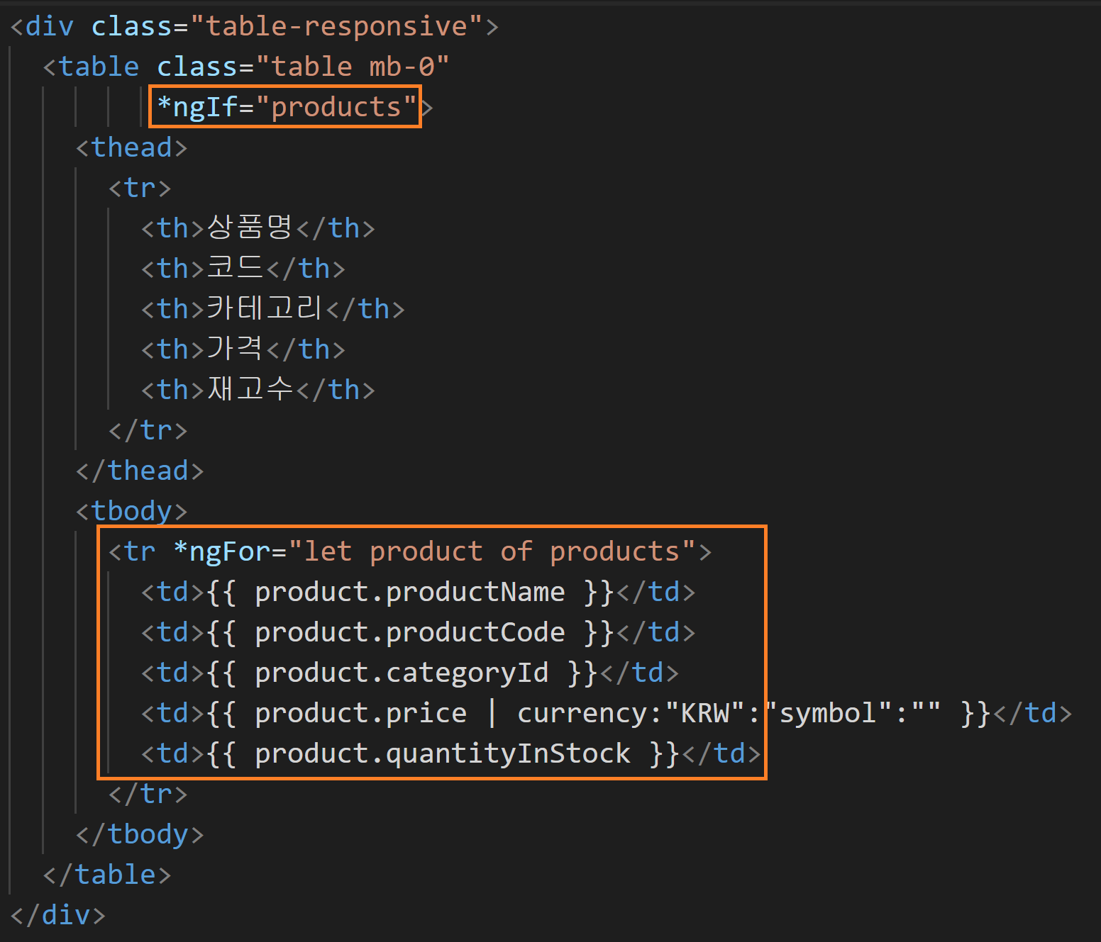 화면의 뷰를 담당하는 제품 목록 템플릿에서 ngIf지시문을 사용하여 테이블을 표시하기 전에 표시할 데이터가 있는지 확인합니다. products에 데이터가 존재한다면 ngFor지시문을 사용하여 product 배열의 각 product를 반복하여 테이블 행에 표시하게 됩니다.