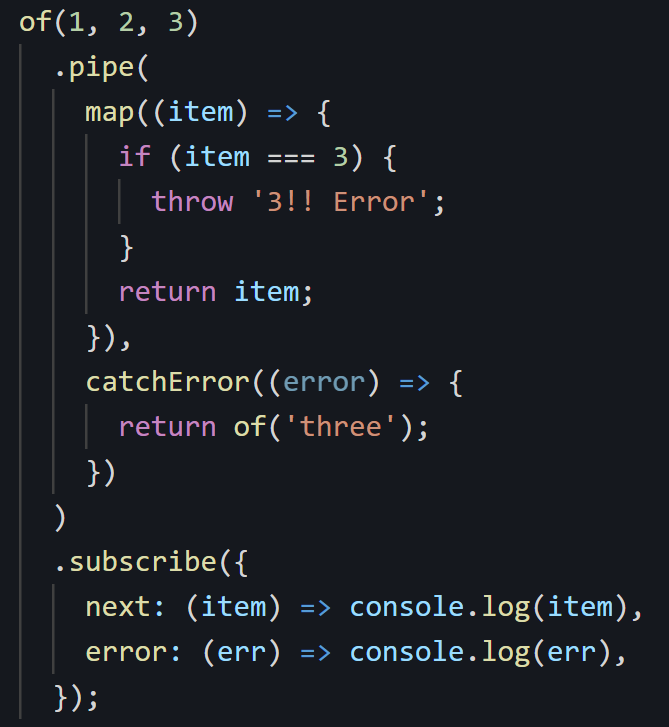 콘솔 로그에 1, 2, three가 출력되었습니다. 에러가 발생하면 catchError가 에러를 잡고 처리하기 때문에 옵저버는 에러 알림을 받지 못합니다. 대신 옵저버의 next메소드는 새로운 옵저버블에서 방출된 값을 받게 됩니다. 결과적으로 1, 2는 처음 of(1,2,3)의 옵저버블에서 방출된 값이 출력되었고, three는 catchError에서 에러를 잡은 후 of('three')에 의해 만들어진 새 옵저버블에 의해 방출된 값이 출력되었습니다.