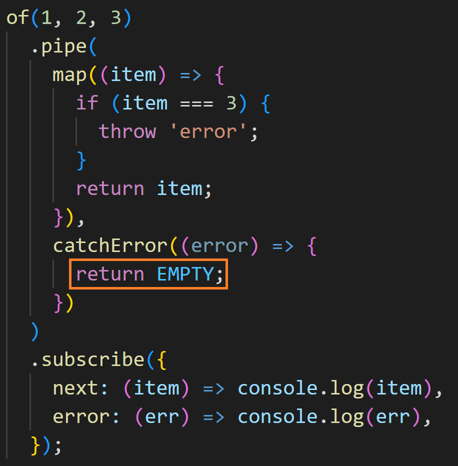 위에서 map연산자에서는 방출된 값이 3인 경우 throw를 통해 에러를 발생하고 있습니다. catchError에서 에러를 잡은 후 of연산자를 사용하여 새로운 옵저버블을 만들고 리턴해 주고 있습니다. 결과값을 예상해 보세요.