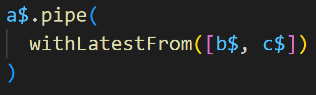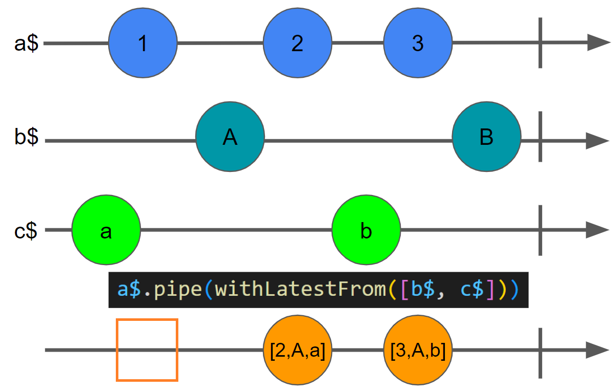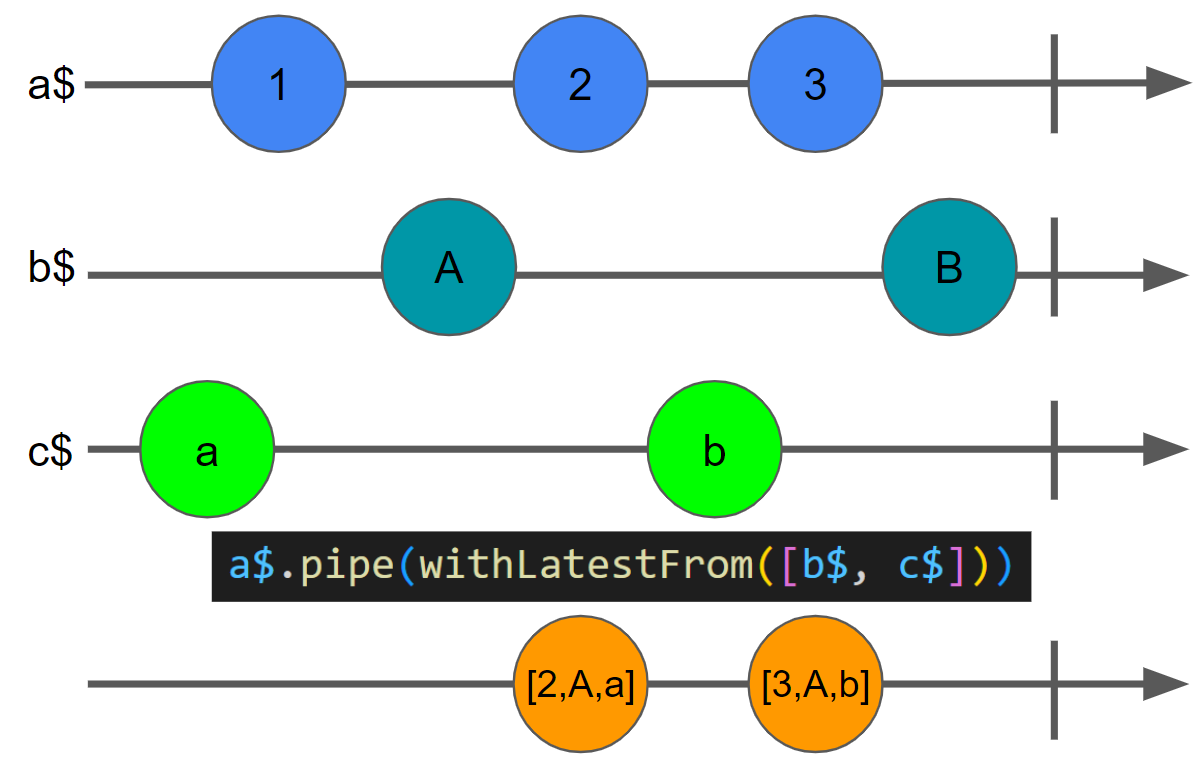 위 예제에서 소스 옵저버블은 a$입니다. a$ 옵저버블의 파이프를 통해 두 개의 다른 옵저버블 b$, c$를 withLatestFrom을 이용해서 결합해 주고 있습니다. 그리고 withLatestFrom은 다시 하나의 옵저버블을 만들어 줍니다. 이 결합으로 생겨나는 옵저버블은 시작은 a$ 소스 옵저버블입니다. 소스 옵저버블에서 항목이 방출되지 않으면 아무일도 일어나지 않습니다. 따라서 결합된 옵저버블은 소스 옵저버블인 a$가 방출될 때만 출력 옵저버블로 방출됩니다.