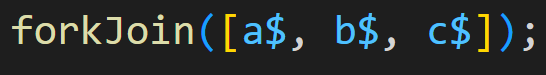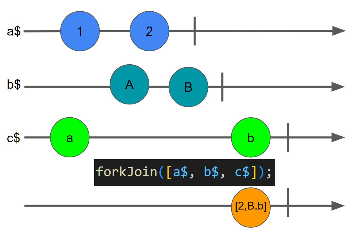 위 예는 3개의 옵저버블에서 하나의 옵저버블을 생성하고 있습니다. forkJoin으로 생성한 옵저버블은 단 한번의 값을 방출합니다. 값을 방출할때는 입력 옵저버블이 모두 완료될때 입니다. 이때 방출된 값은 각 옵저버블의 마지막 값이 배열로 결합된 형태 갖습니다. frokjoin은 파이프 연산자가 아닌 정적 생성함수임을 기억해주세요.