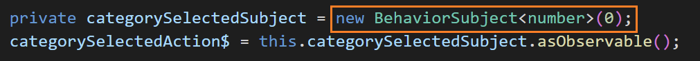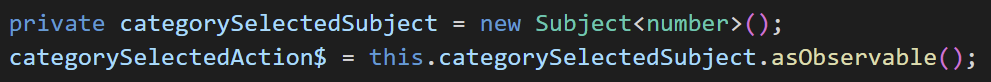 number를 방출하는 Subject를 만들고 변수에 할당해 주었습니다. categorySelectedSubject는 다른 코드에서 Subject를 사용해서는 안 되므로 비공개로 정의하였습니다. 사실 이번 Subject는 서비스가 아닌 component에서 정의하고 있기 때문에 실제로 비공개로 선언할 필요는 없습니다. 하지만 Subject를 만들 때는 항상 private로 만드는 패턴을 따르는 것이 코드를 작성할 때 도움이 됩니다. Subject를 만든 다음 asObservable를 사용하여 Subject의 옵저버블을 노출합니다.