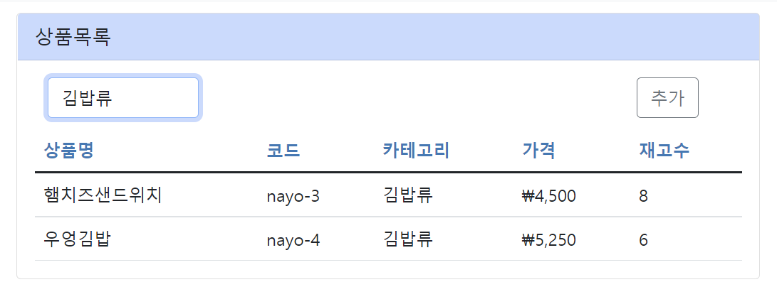 카테고리에서 김밥류를 선택하였습니다. 카테고리를 선택하면 필터링된 데이터가 잘 표시됩니다.