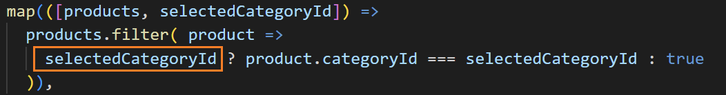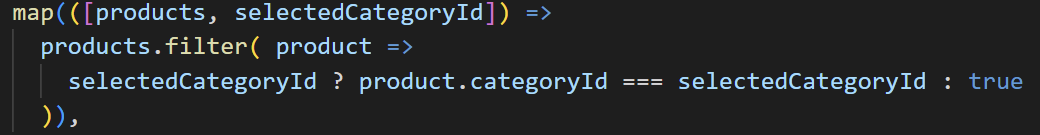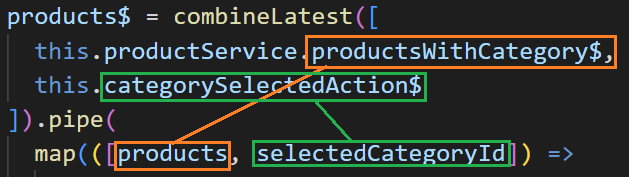 pipe처리의 map에서 방출된 배열 요소를 구조화합니다. 첫 번째 스트림은 제품의 배열을 방출하므로 첫 번째 배열 요소의 이름을 products로 지정하였습니다. 두 번째 스트림은 사용자가 셀렉트 박스에서 값을 카테고리를 선택할 때마다 selectedCategoryId를 내보냅니다. 따라서 두 번째 배열 요소의 이름을 selectedCategoryId로 지정하였습니다.