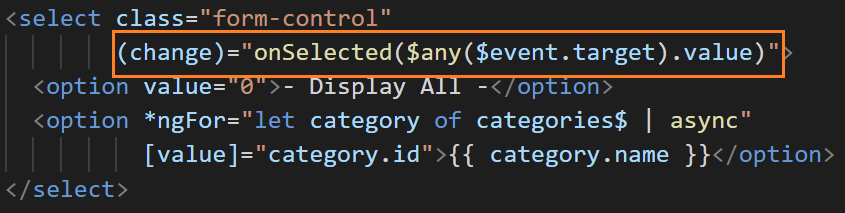 템플릿 코드를 보면 select 박스의 값이 변할 때 선택한 값을 매개변수로 건네주며 onSelected를 호출하고 있습니다. 그럼 onSelected 메서드를 보겠습니다.
