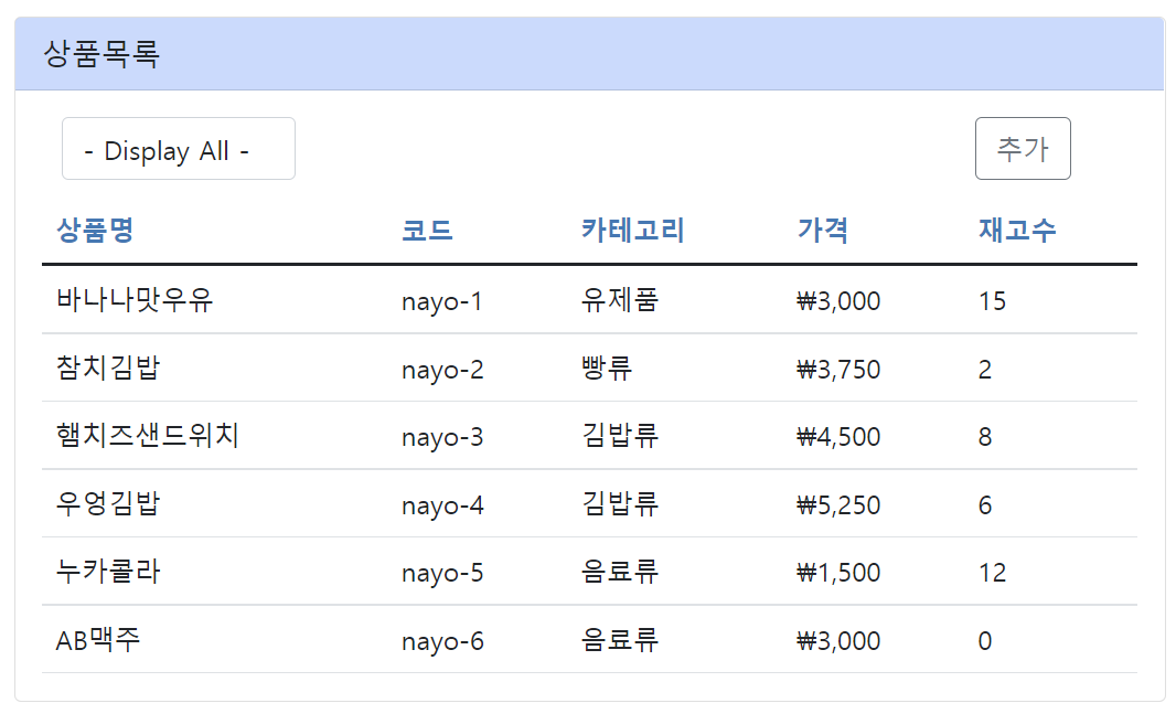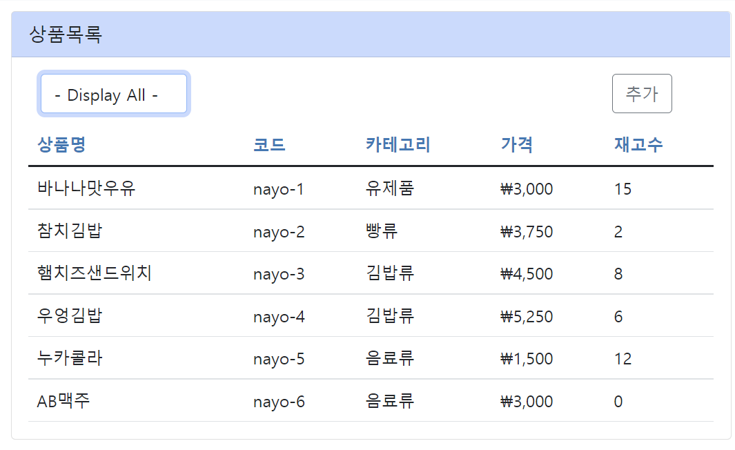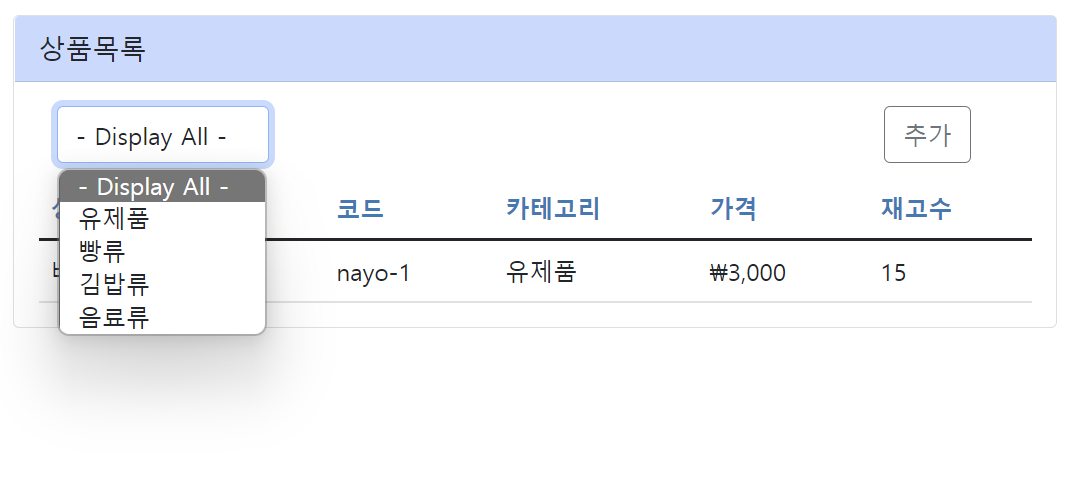 실습 목표는 select box에서 선택되는 카테고리 선택에 따라 제품 목록을 필터링하여 화면에 표시하는 것입니다. 현재 화면은 아래와 같은 모습을 하고 있습니다.
