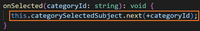 onSelected 메서드에서는 Subject의 next 메소드를 사용하여 selectedCategoryId를 스트림으로 내보냅니다. next 메서드에서 +categoryId로 매개변수를 넘기고 있는데, ID를 숫자로 변환하기 위해서입니다.
