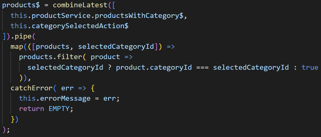 두 개의 스트림을 CombineLatest에 전달하고 있습니다. productsWithCategory$는 http get을 통해 생성되는 데이터 스트림입니다. categorySelectedAction$은 유저가 카테고리를 선택할 때 선택한 값을 방출하는 액션 스트림입니다. CobineLatest를 사용하면 카테고리를 선택할 때마다 데이터와 선택 값을 방출하는 옵저버블을 얻을 수 있습니다.