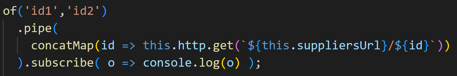 of('id1', 'id2')로 생성되는 소스 옵저버블은 id1과 id2라는 두 개의 문자열을 방출하고 값이 버퍼링됩니다. 생성 함수를 사용하기 때문에 of로 생성되는 외부 옵저버블은 complete 됩니다.
