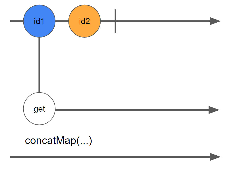옵저버블을 구독하고 get 요청이 발행됩니다. concatMap은 다시 응답을 기다리고 응답이 반환되면 내부 옵저버블에서 방출된 데이터가 출력 옵저버블에 연결(concat)되고 내부 옵저버블이 complete 됩니다. 결과적으로 데이터는 순서대로 출력 스트림으로 방출됩니다.