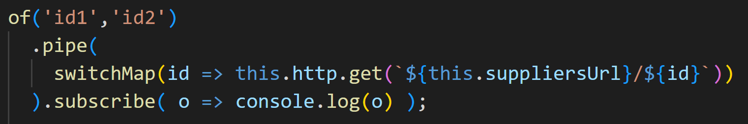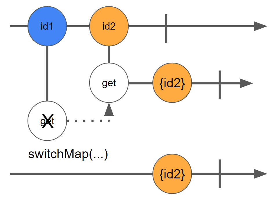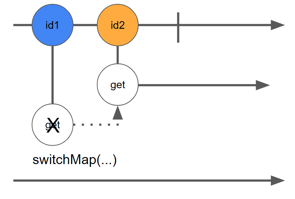 id2가 방출되면 매핑 함수가 실행되어 새로운 옵저버블 항목을 생성합니다. 그런 다음 switchMap은 새 항목을 구독하면서 이전 옵저버블 항목에서 새 옵저버블 항목으로 전환합니다. 이 예에서는 id1에서 생성된 옵저버블이 방출하기 전에 구독을 취소하게 됩니다.