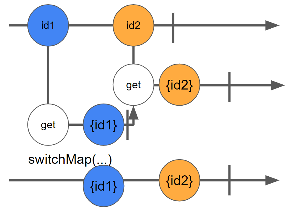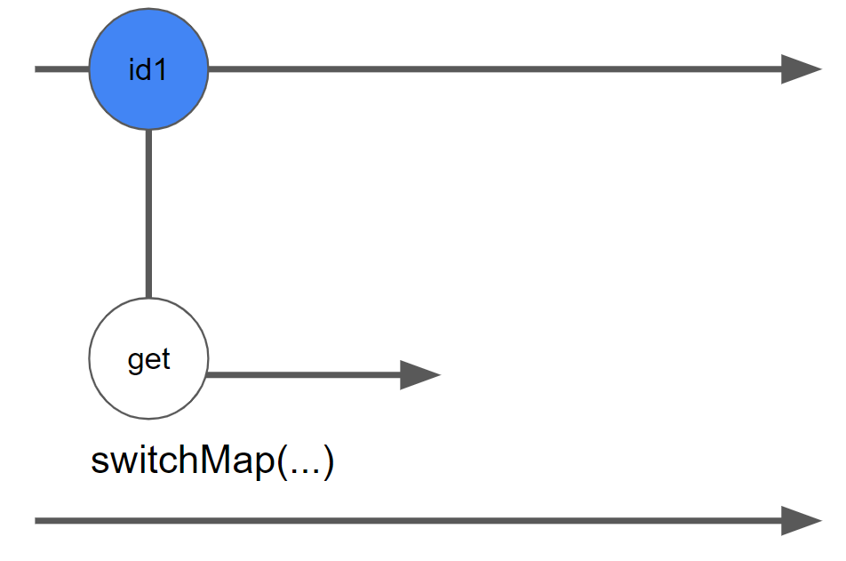 'id1'이 방출되면 매핑 함수가 실행되어 새로운 옵저버블 항목을 생성합니다. 그런 다음 해당 옵저버블을 구독하고 get 요청이 발행됩니다. get의 응답이 아직 도착하지 않았지만 입력 옵저버블에서 두 번째 항목이 방출되었습니다.
