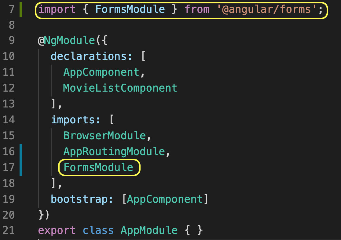 이제 ngModel과 FormsModules에 있는 디렉티브들을 MovieListComponent를 포함한 AppModule에서 선언된 모든 컴포넌트에서 사용 가능합니다.