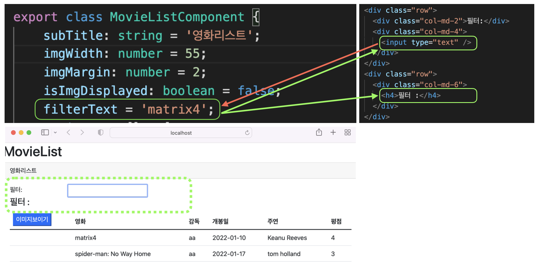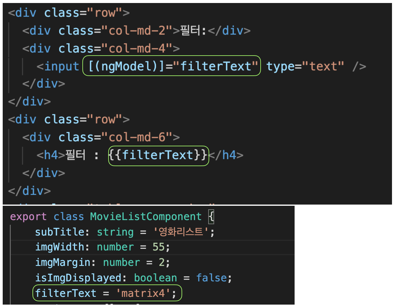 input에서는 ngModel을 이용해 양방향 바인딩하였으므로 유저가 input 내용을 변경한다면 컴포넌트의 filterText라는 속성도 변경되어 h4의 내용도 업데이트되겠네요.