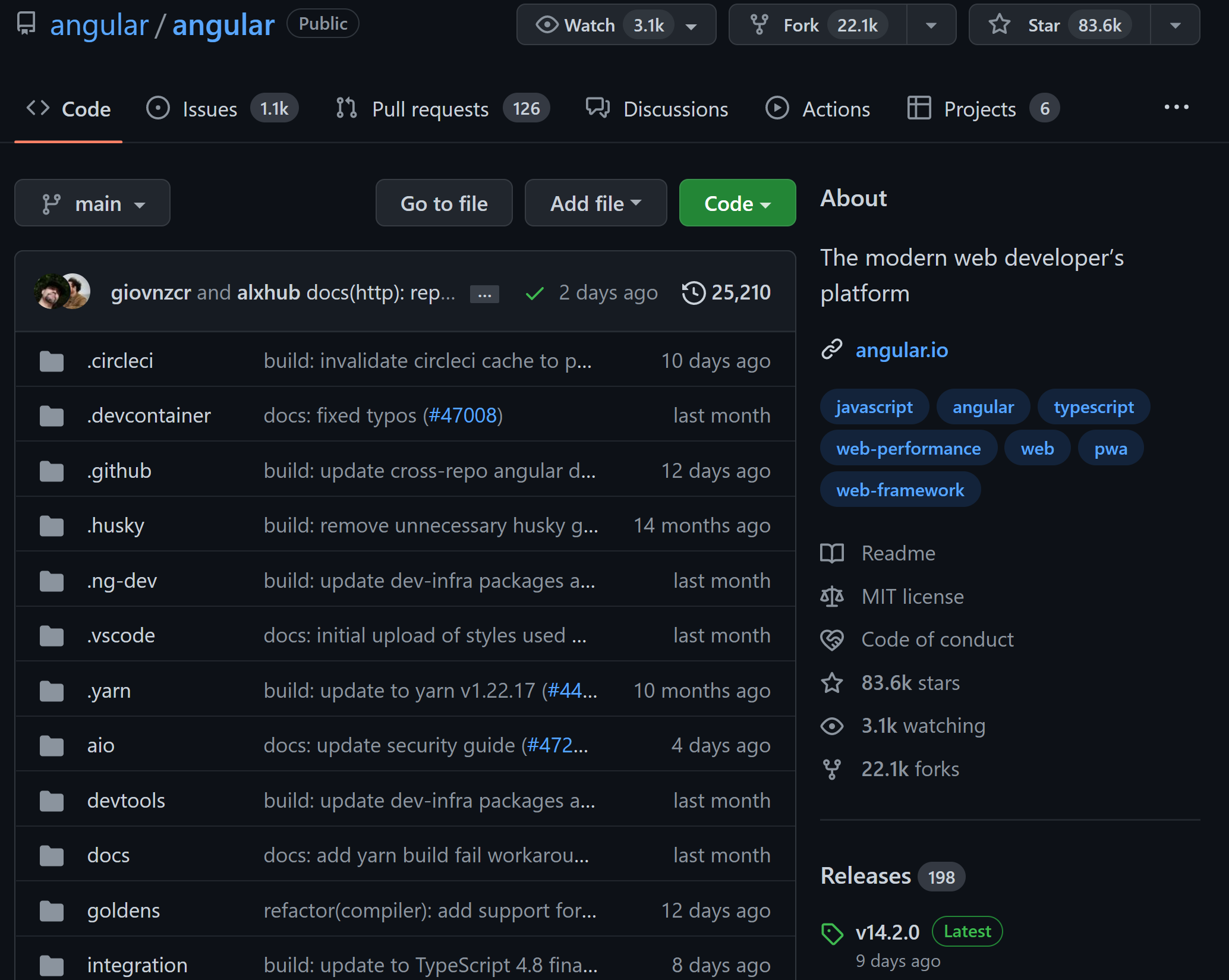 아래 화면 캡쳐는 github의 angular 리포지토리의 랜딩 페이지입니다.