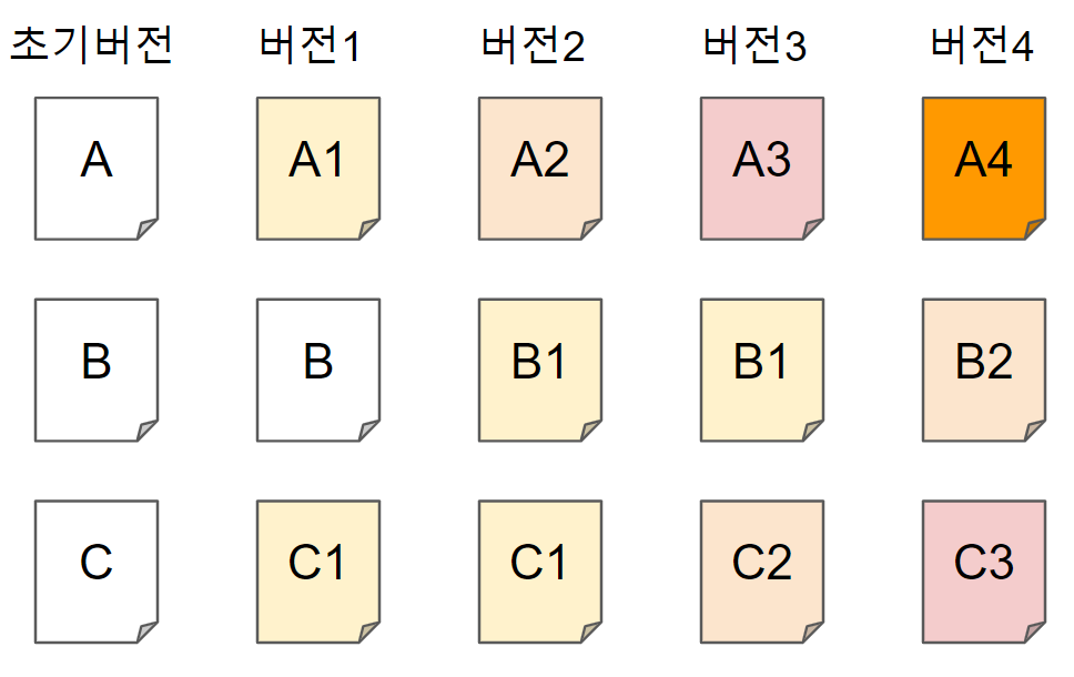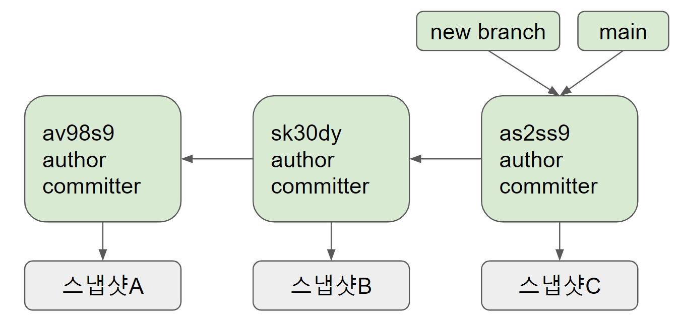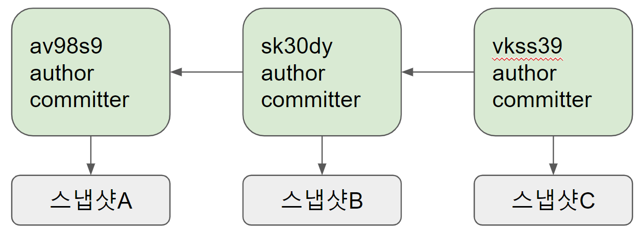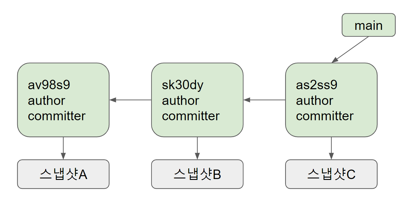커밋을 할 때 모든 파일의 스냅숏이 만들어지고 모든 파일에 대해 커밋 시점의 참조가 생성됩니다. 만약 파일이 변경되지 않았다면 git은 이전의 동일한 파일에 대한 링크만 저장합니다. 이런 깃의 스냅샷은 파일간의 차이점인 델타값을 저장하는 다른 소스 코드 관리 시스템과의 주요 차이점 중 하나입니다.