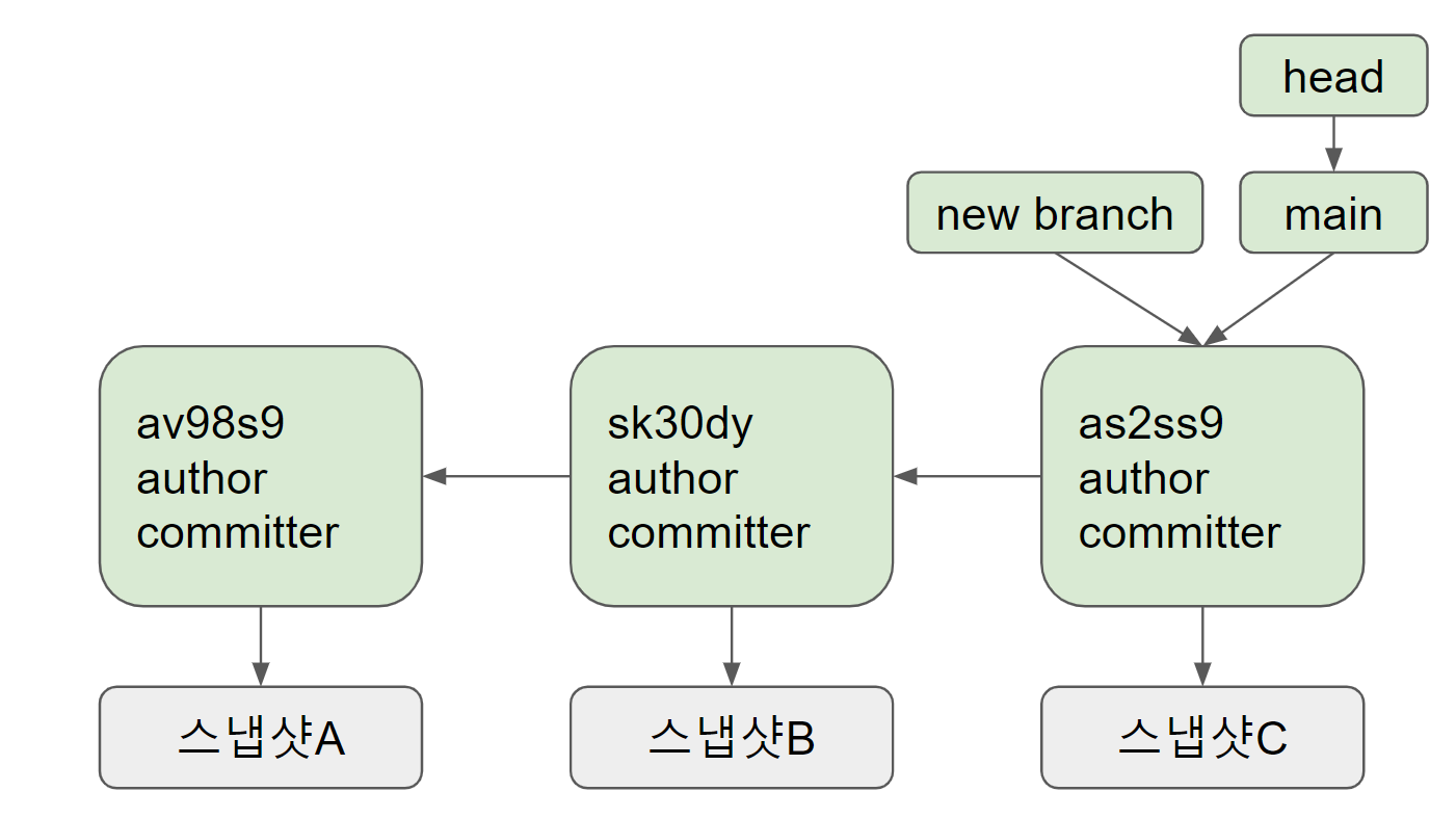 그리고 기본적으로 main브랜치에서 작업하며 새 브랜치를 생성해도 작업하는 브랜치는 변경되지 않습니다. 그럼 작업자가 어떤 branch에 있는지 추적하는데 필요한 정보가 있어야 할 것입니다. 현재 어떤 브랜치에 있는지는 특수 지점인 head를 사용하여 추적합니다.