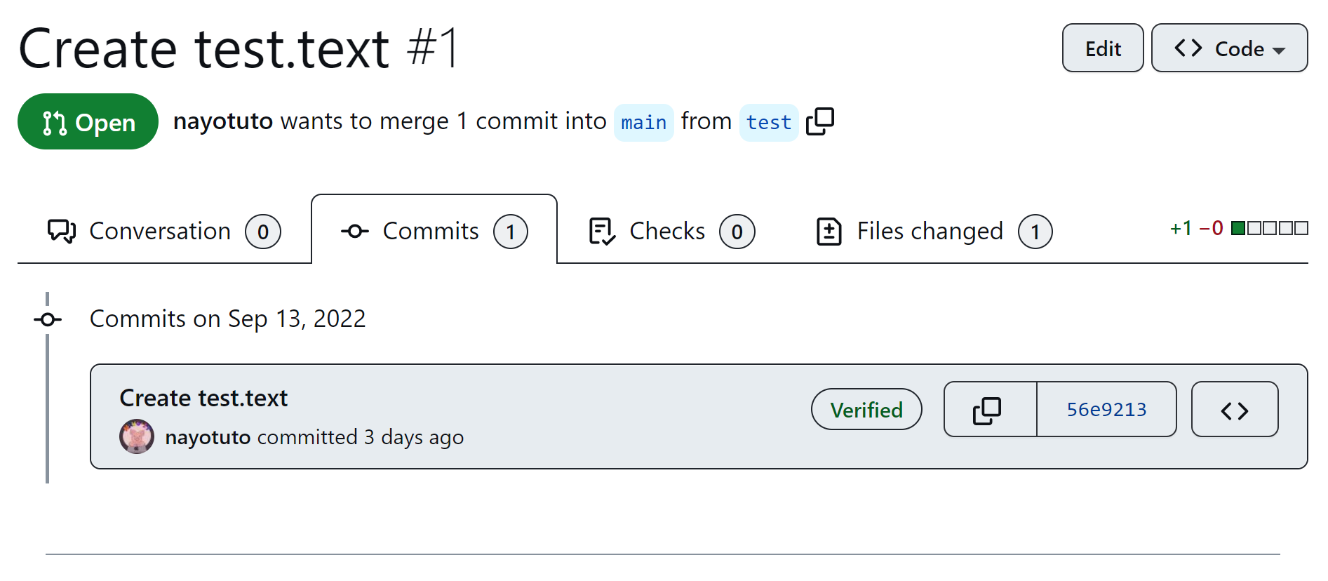 commits 탭에서 어떠한 커밋이 포함되어있는지 확인이 가능합니다.