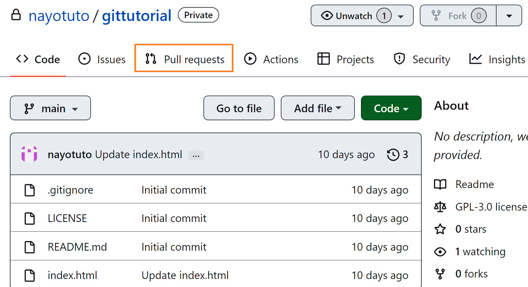 두 번째 방법은 Pull requests 탭을 이용하는 것입니다. pull requests 탭이 접근하기 쉬우므로 많이 사용됩니다.