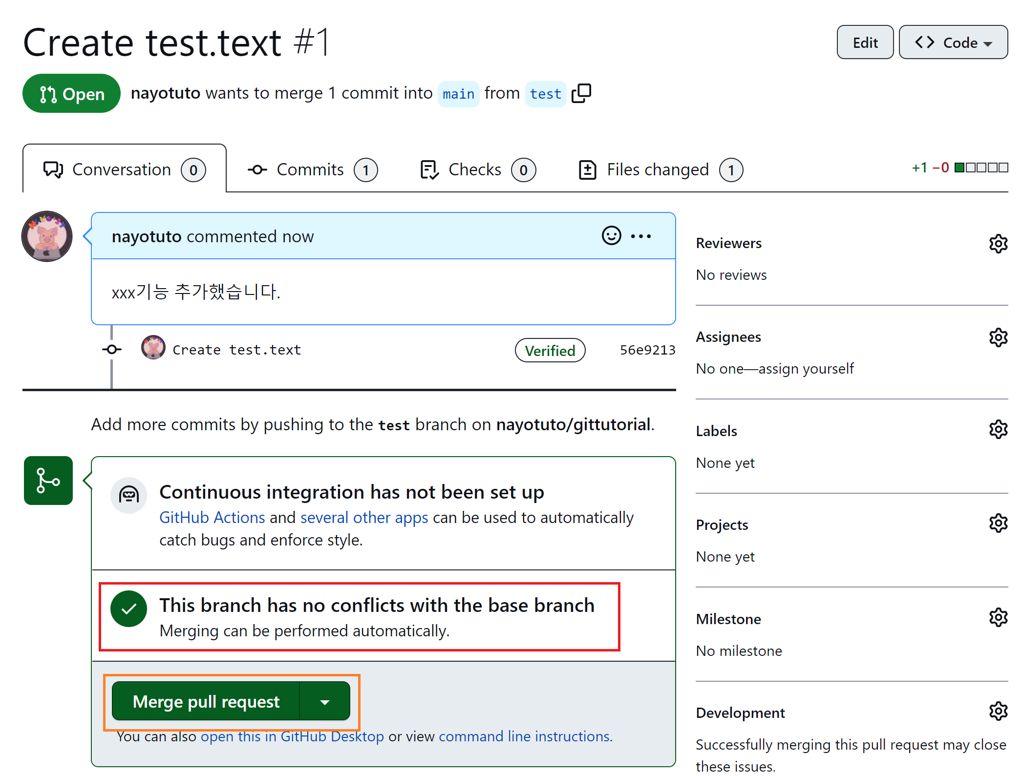 생성된 풀리퀘스트의 메시지를 보면 conflict(코드 간 충돌)이 없다고 나옵니다. 그리고 merge pull request 버튼이 활성화되어있습니다. 만약 conflict가 있다면 머지를 할 수 없고 conflict를 없애야 합니다. conflict를 해결하는 것 역시 머지 리퀘스트를 만든 개발자의 역할이니 풀 리퀘스트를 만들고 conflict가 있는지 반드시 확인해야 합니다.