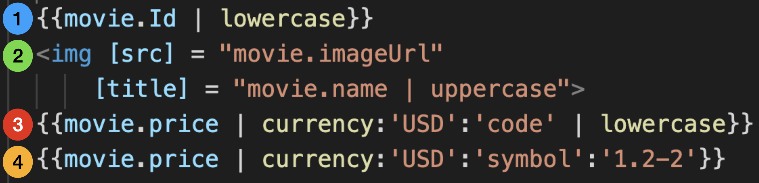 Angular에는 date, number, decimal, percent, currency, uppercase, lowercase 등과 같은 형식 지정 값을 위한 기본 제공 파이프를 제공하고 있습니다.