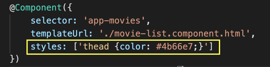 스타일의 독립적인 적용과 관리를 위해 컴포넌트 데코레이터(@component)에는 컴포넌트 정의의 일부로 스타일을 캡슐화하는 프로퍼티가 있습니다.