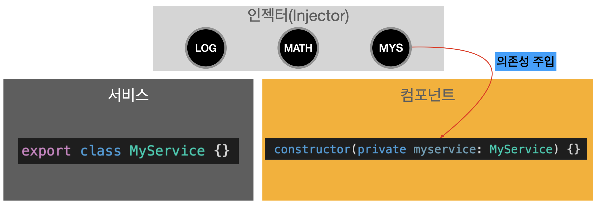 위의 그림에서 앵귤러 인젝터는 log, math, mys(MyService)라는 세 가지 다른 서비스의 인스턴스를 관리하고 있습니다.