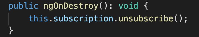 위의 코드에서 Observable 구독 후 리턴되는 subscription을 클래스의 변수에 저장해 놓은 후, ngOnDestroy에서 취소를 하고 있습니다.