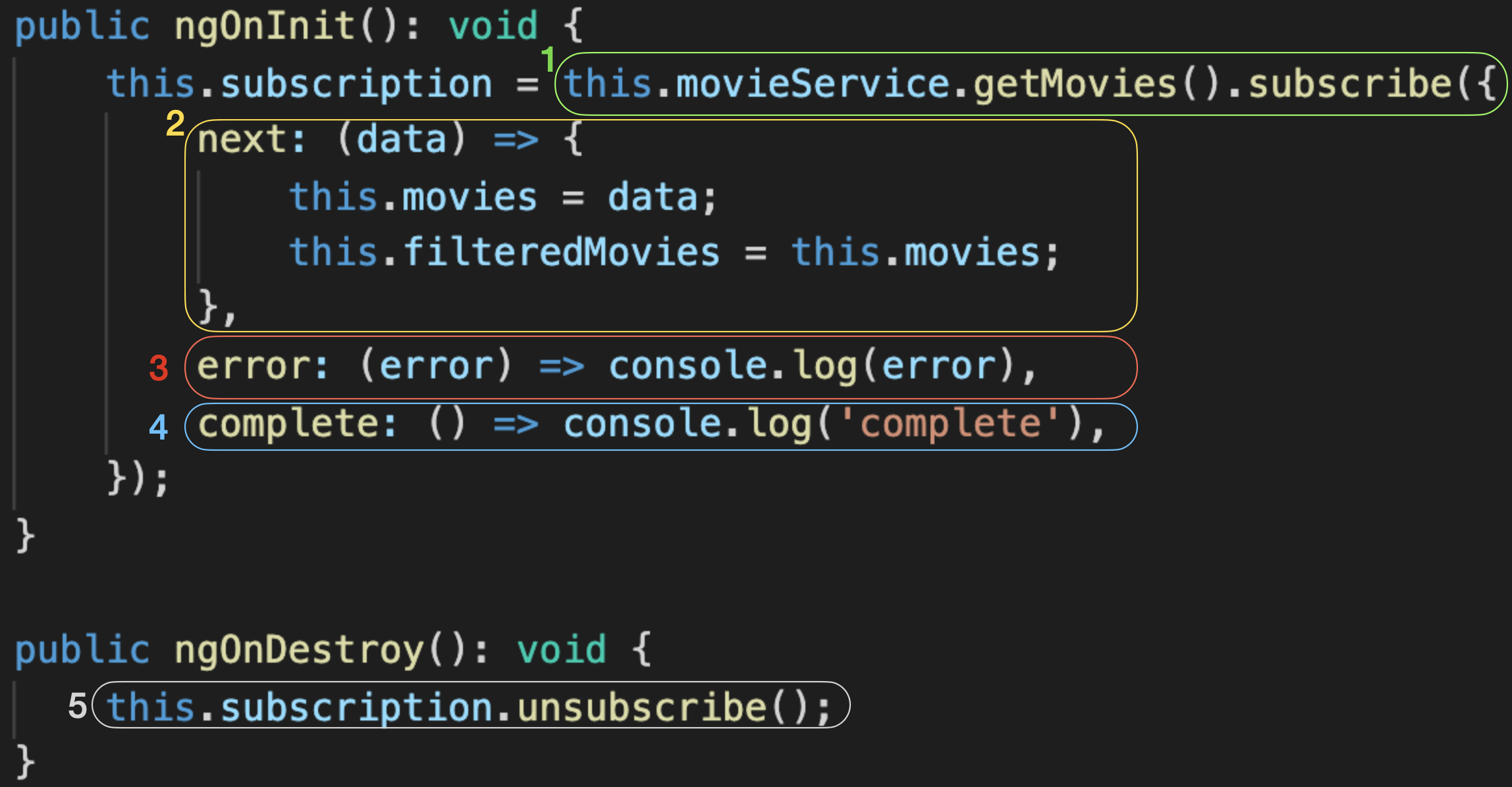 구독 취소는 일반적으로 subscription을 변수에 저장한 후, OnDestroy생명주기 훅에서 구독을 취소하게 됩니다.