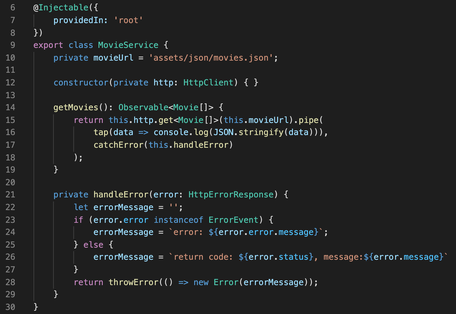 코드에서는 catchError 연산자는 에러가 검출됐을 시 다시 handleError메서드를 이용해 에러 처리에 관련된 로직을 수행하게 만들었습니다.