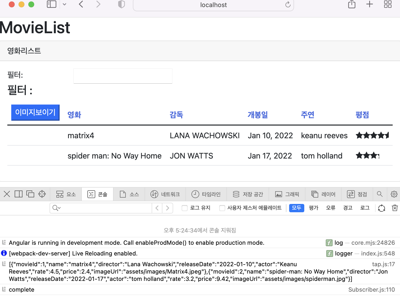 2.next에서는 Obseservable이 항목을 방출할 때마다 취할 조치를 지정합니다. 이때 메소드 매개변수는 방출된 항목입니다. http호출은 단 한 번의 비동기 작업이므로 movie배열에 매핑된 http response개체인 항목 하나만을 배출하게 됩니다.