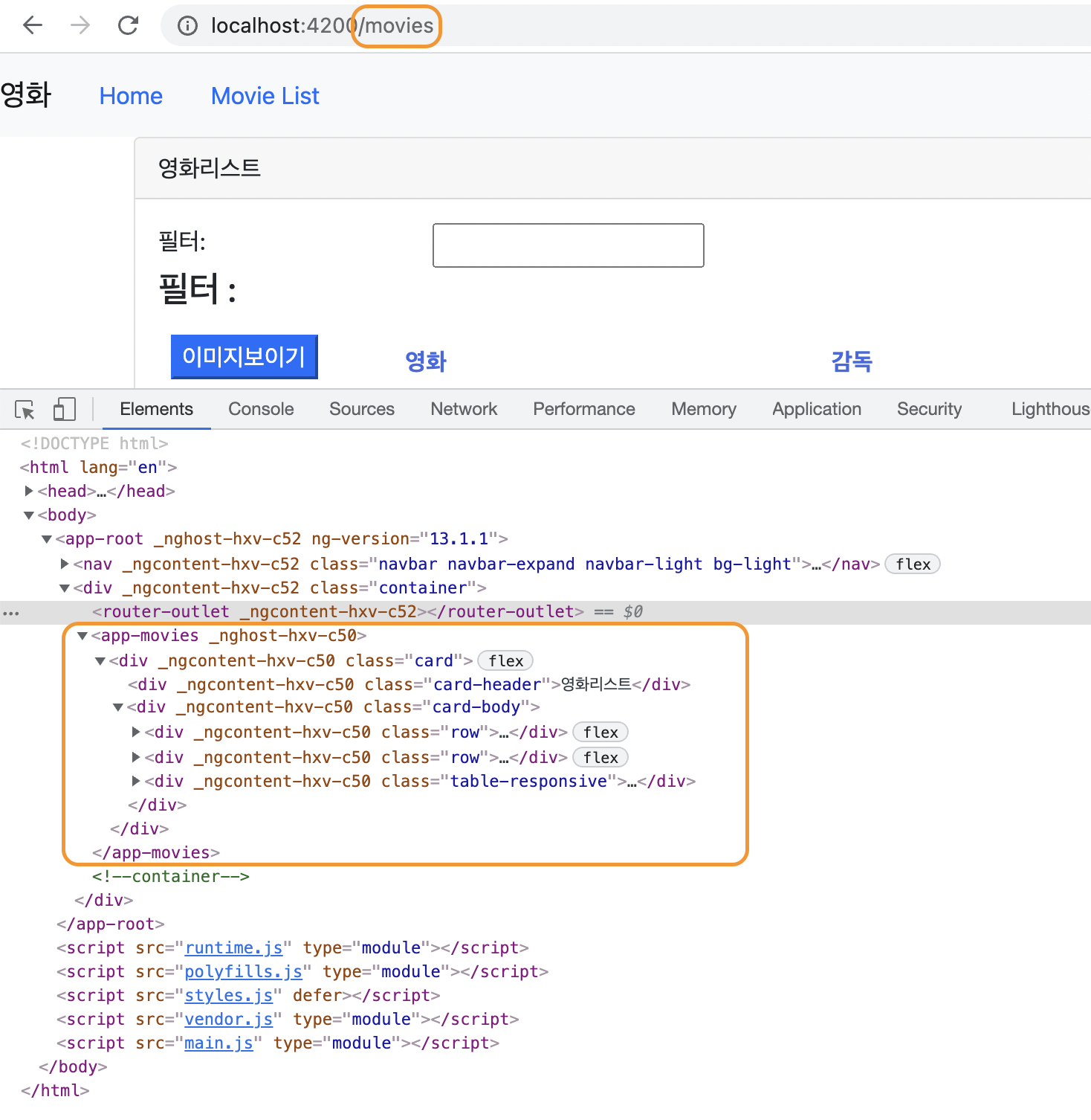 이제 기존에 보였던 영화 리스트의 뷰는 보이지 않고, 최상위 컴포넌트(AppComponent)의 템플릿 내용만 표시되고 있네요.