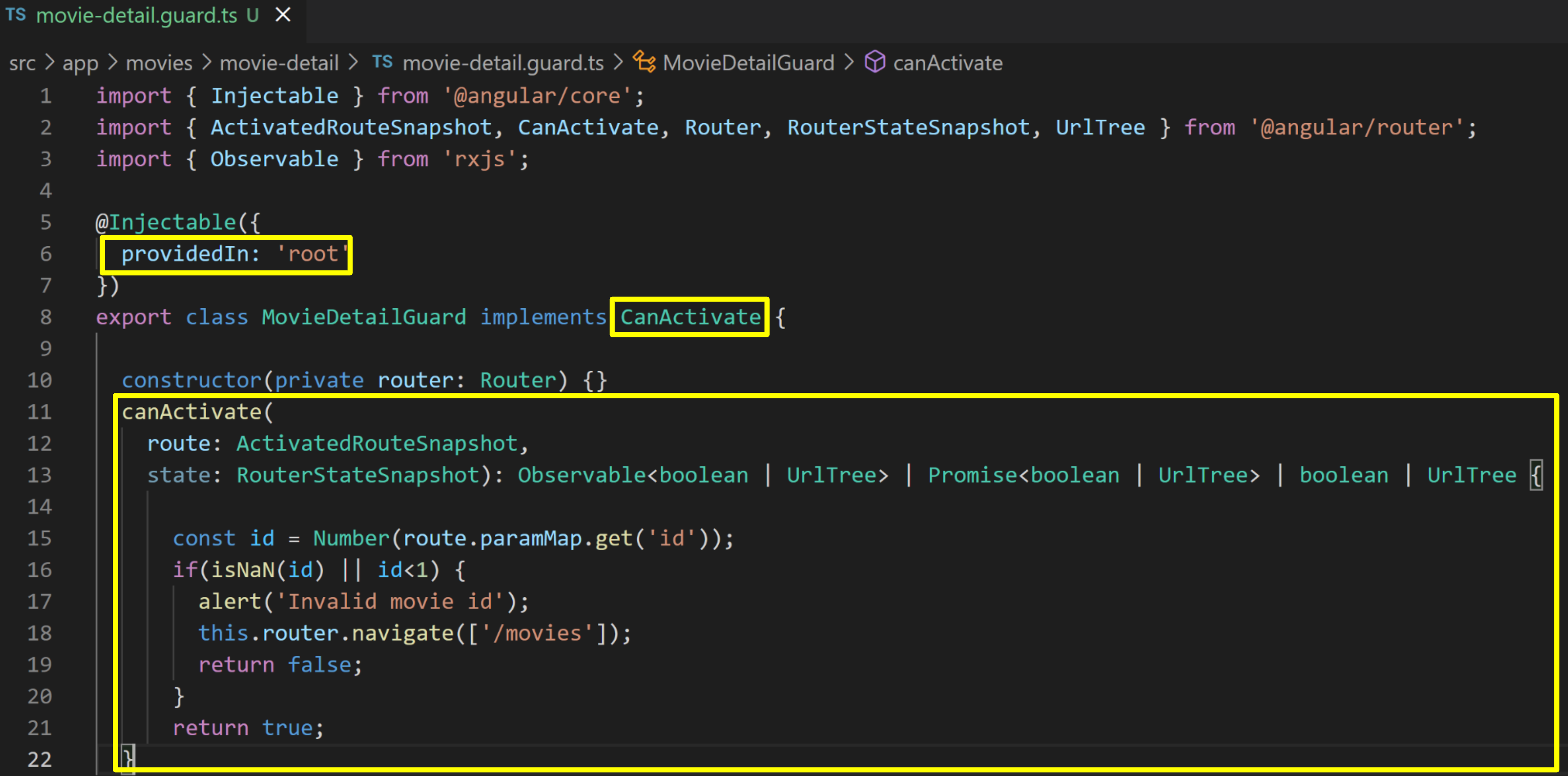 ActivatedRouteSnapshot의 paramMap을 이용해서 경로의 파라미터인 id값을 가져오고 id가 넘버가 아니거나 1보다 작으면 경고를 표시하고, 영화 리스트로 다시 경로를 변경한 후 false를 리턴해 주도록 작성하였습니다.
