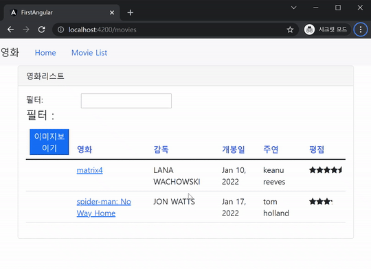 영화 목록 페이지에서 영화를 선택하여 이동하면 url이 유효 하므로 상세 페이지로 이동하고, 숫자가 아닌 url을 입력하면 메시지가 표시되고 영화 목록 페이지로 리다이렉션 됩니다.
