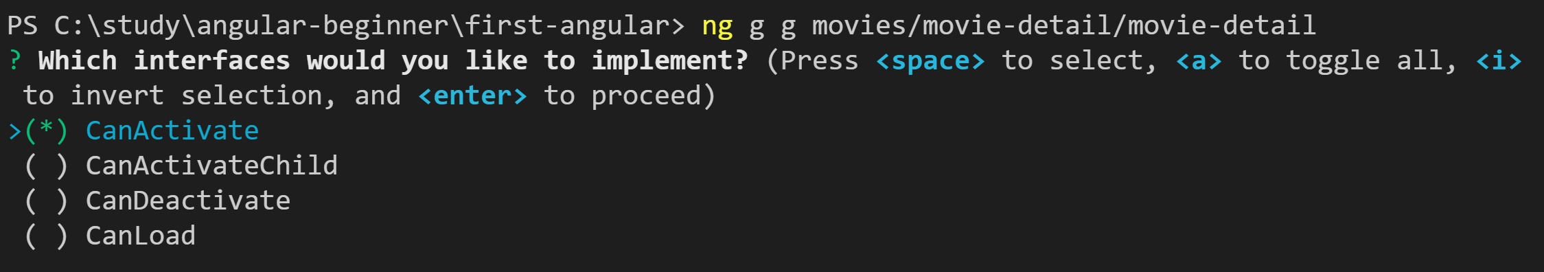 커맨드를 실행하면, 아래와 같은 선택이 나오고 하나 이상의 가드를 선택할수 있습니다. 예제 에서는 CanActivate를 선택주었습니다.