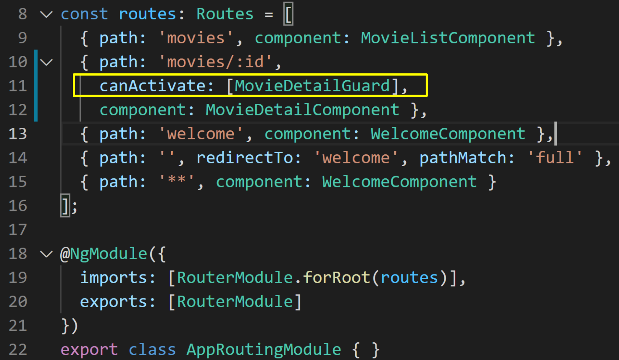 MovieDetailComponent의 경로 정의에 canActivate속성을 추가하고 가드 담당 클래스를 배열로 추가 하였습니다.