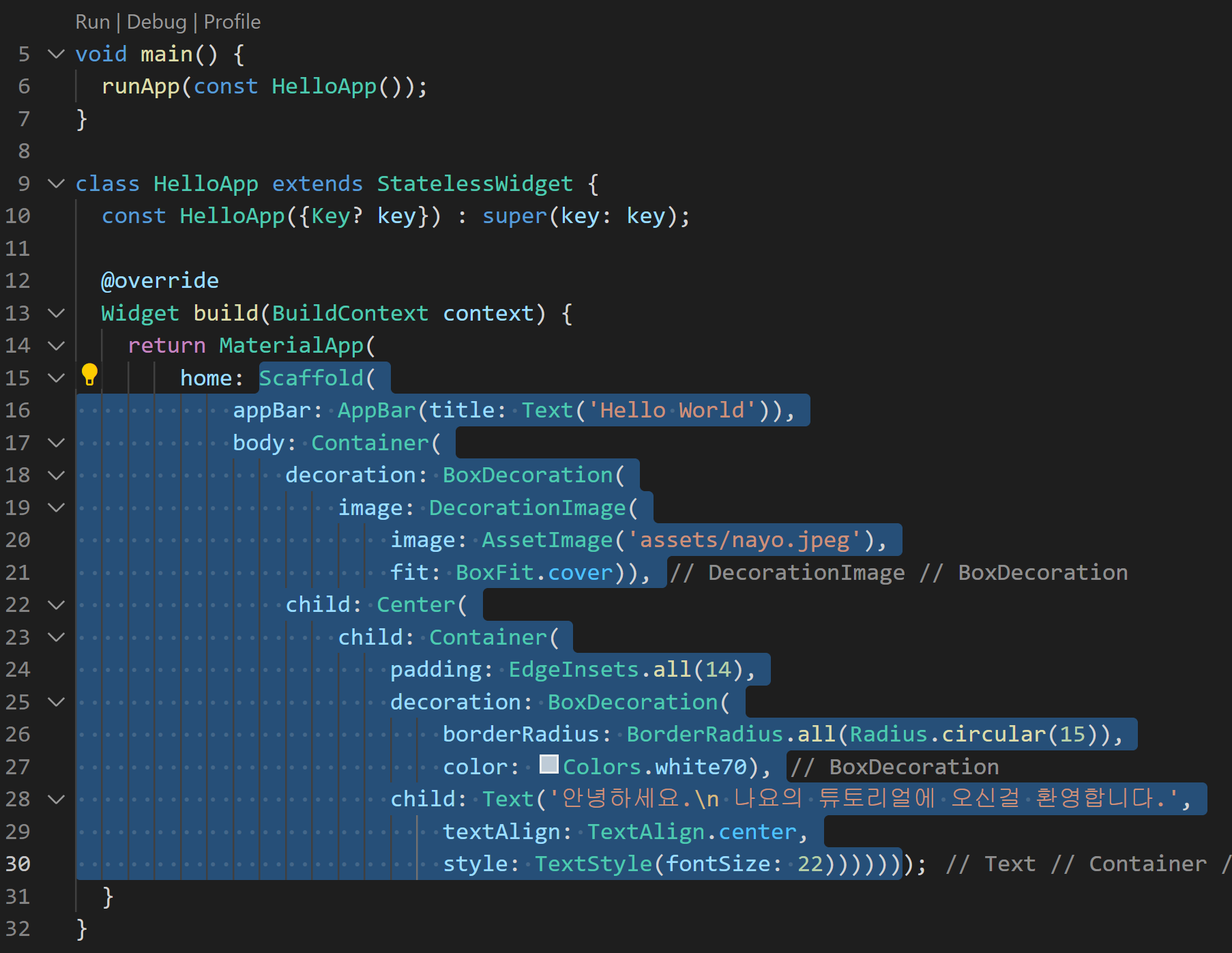 return 이후의 Scaffold부터 시작하는 위젯 트리를 main.dart에서 가져와서 붙여 넣었습니다.