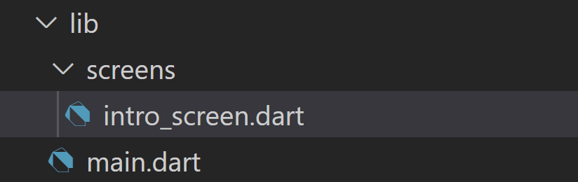 위 소스의 선택된 부분을 잘라내어 새 파일로 이동시킬 계획입니다. 먼저 lib폴더에 새 폴더를 screens라는 새 폴더를 생성하겠습니다. 그리고 생성한 폴더 아래로 intro_screen.dart 파일을 만들어 주겠습니다.