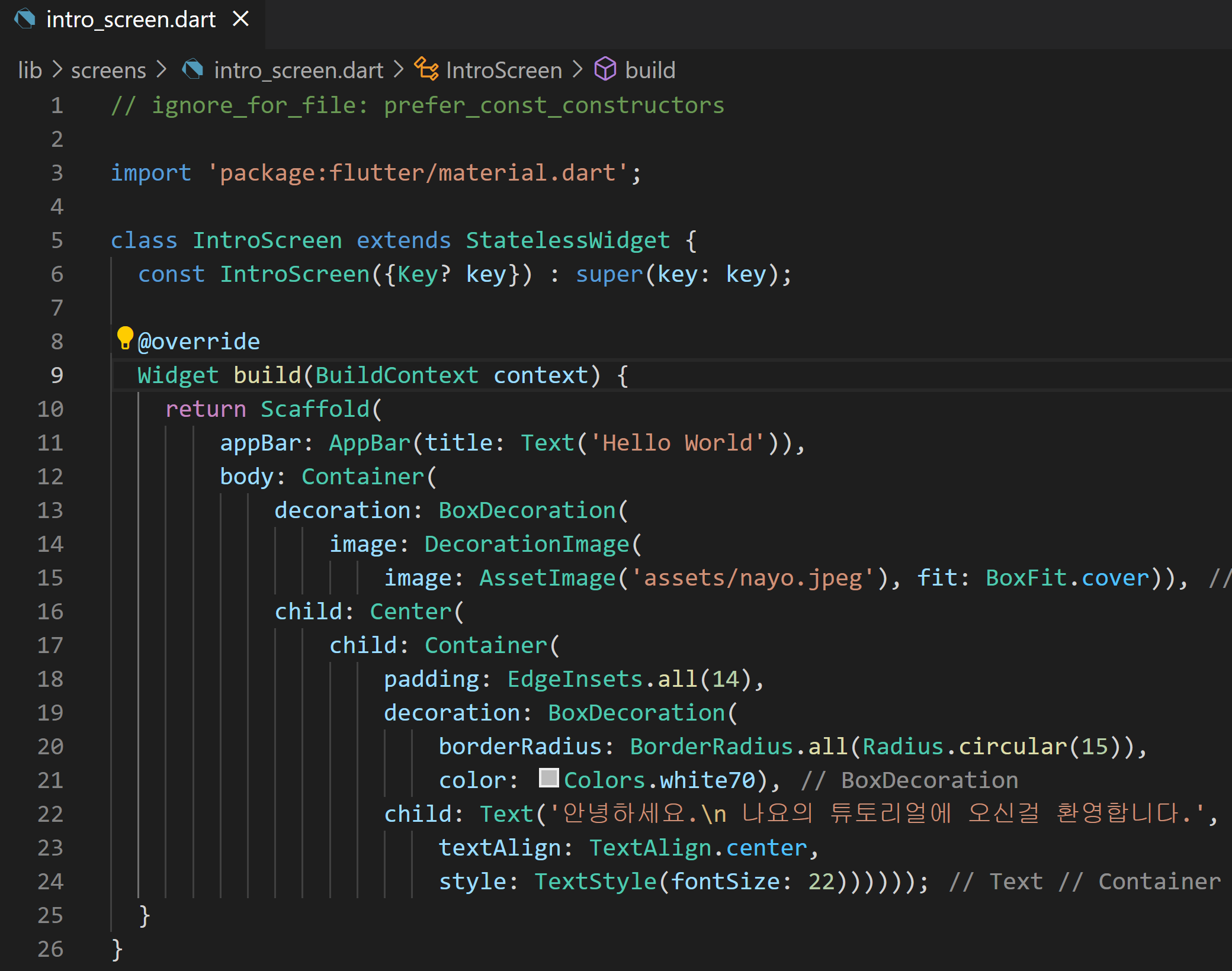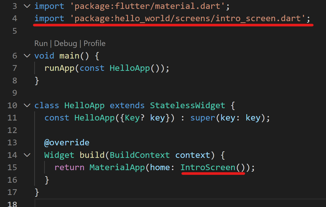 import로 intro_screen을 가져오고 MaterialApp의 home에는 이제 IntroScreen을 넣어 주었습니다. import문을 보면 전체 패키지이름으로 가져오고 있는데, 프로젝트 내에서 파일을 가져오는 경우에는 상대경로로도 사용할 수 있습니다.