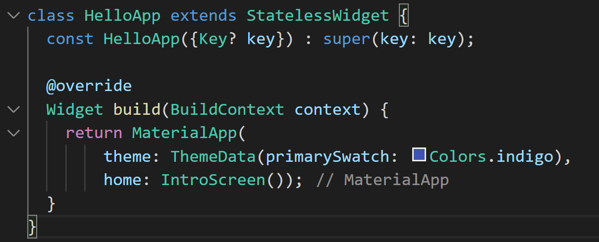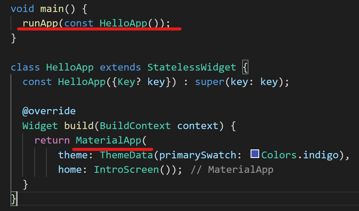 위 예제에서 다른 모든 위젯을 포함하는 위젯은 MaterialApp이고, home 매개변수에는 화면에 표시하려는 위젯이 포함되어 있어야 합니다. home에는 IntroScreen을 넣어주고 있습니다.