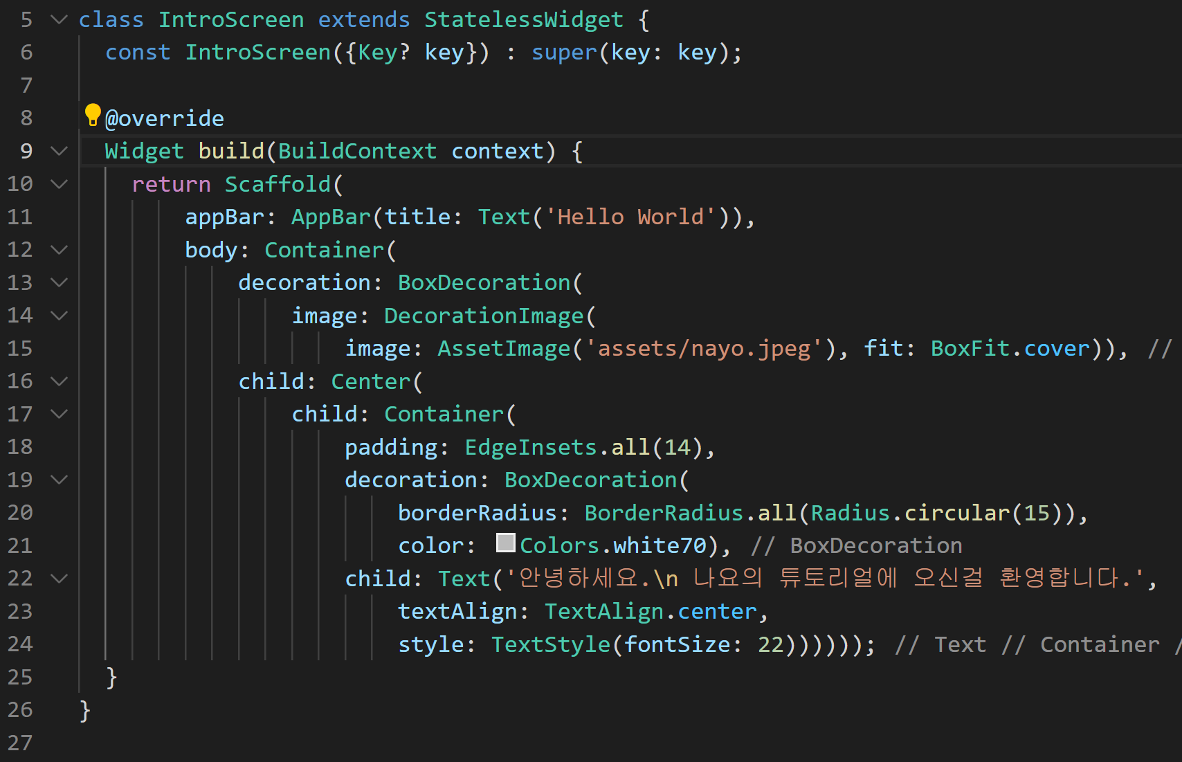 intro_screen.dart파일에서 stateless 위젯을 만들고 main.dart에 있는 Scaffold이하 코드를 가져오겠습니다. 새로 만든 intro_screen.dart에 코드를 붙여 넣어 완성한 소스가 아래 입니다.