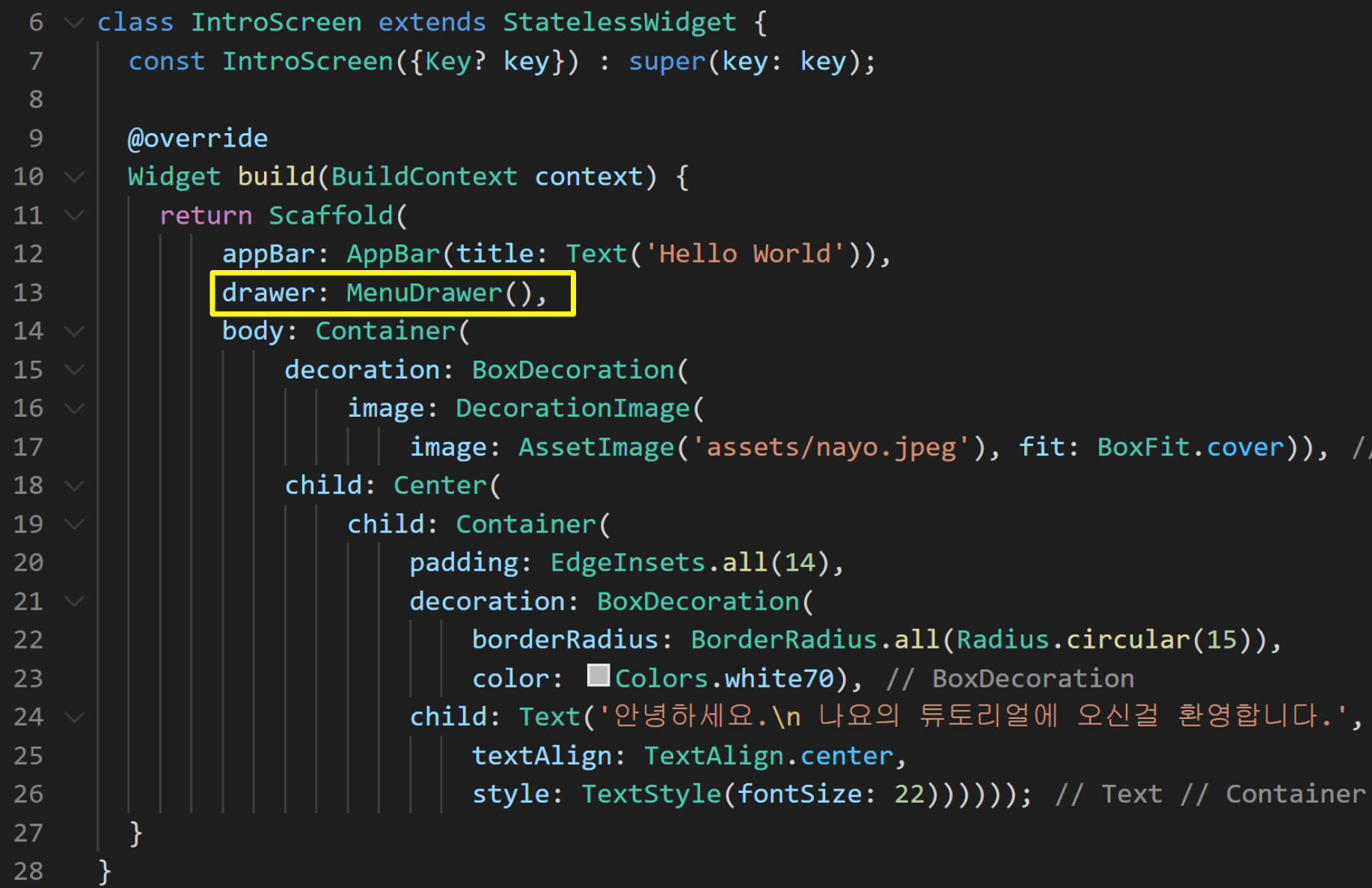 이제 이 서랍메뉴를 유저에게 보여줘야 합니다. 아직은 유일하게 스크린을 담당하고 있는 IntroScreen클래스에서 Scaffold의 drawer 매개변수를 설정 하겠습니다.
